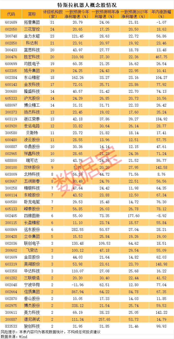 证券时报·数据宝统计,同时拥有特斯拉概念和人形机器人概念的A股股票,且有两家以上机构评级的个股,合计有45只。